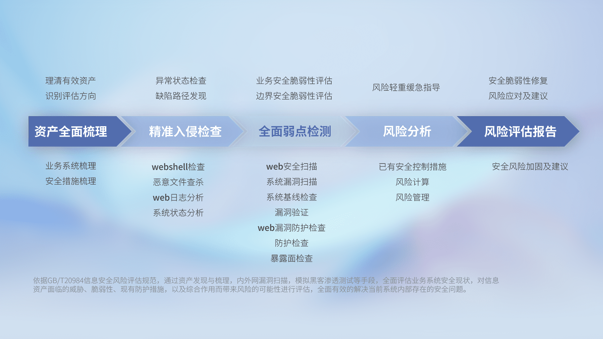 针对客户行业特性,,,以专业的安全服务+多厂商联合解决方案提供专属的一站式安全管理服务,,帮助客户全面感知网络空间威胁,,基于识别、、、、检测、、分析、、、、防护、、、、监测、、、响应的服务理论模型,,,从方案咨询、、、集成交付、、、、评估验证、、优化加固、、、、运维运营,,致力于为客户提供完整的闭环管理式安全服务。。以实战经验为客户打造高抵御风险的安全体系,,,,帮助客户发现威胁、、、对抗威胁、、、处置威胁,,,不断积累安全对抗能力,,持续保障数字化安全。。。。